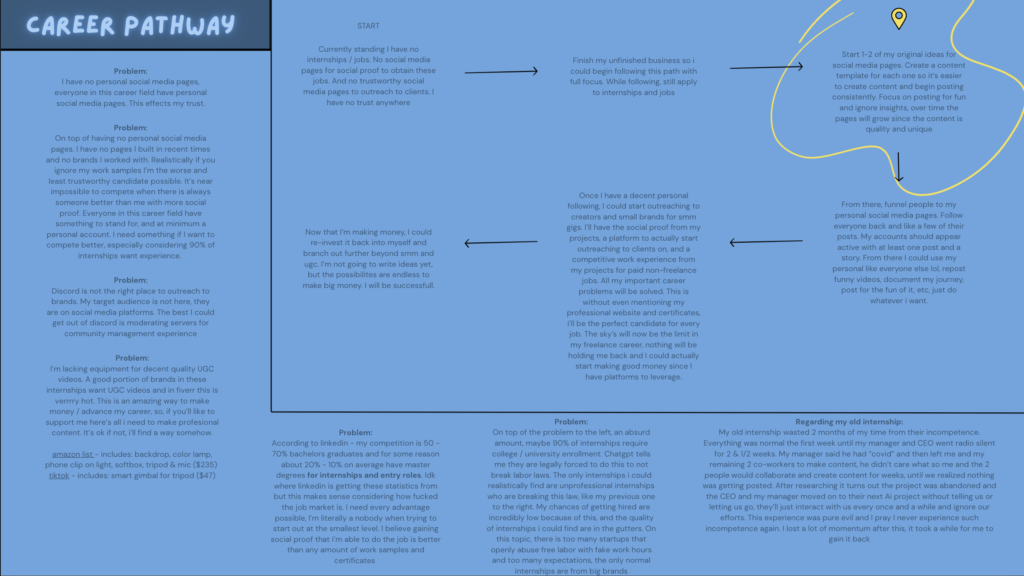 Part 2 of my vision is to funnel people into my personal Instagram & TikTok. Once I have a decent personal following and active community, I’ll start outreaching to creators and small brands for smm gigs. I’ll have the social proof from my projects, a platform to actually start outreaching to clients on, and a competitive work experience & story from my projects for traditional jobs. All my important career problems will be solved. This is without even mentioning my professional website and certificates, i’ll be the perfect candidate for every job. The sky will now be the limit in my freelance career, nothing will be holding me back and I could actually start making good money since I have platforms to leverage. This section was written for those redirected from my work account discord account & Den so you all know where I’m going with this. No false promises, but Ayla’s page is easily gonna skyrocket my career alone. I’m trying to hit 20k/m by the end of Q1. Me updating this website is insignificant to my goals, but I will maybe once or twice a month.