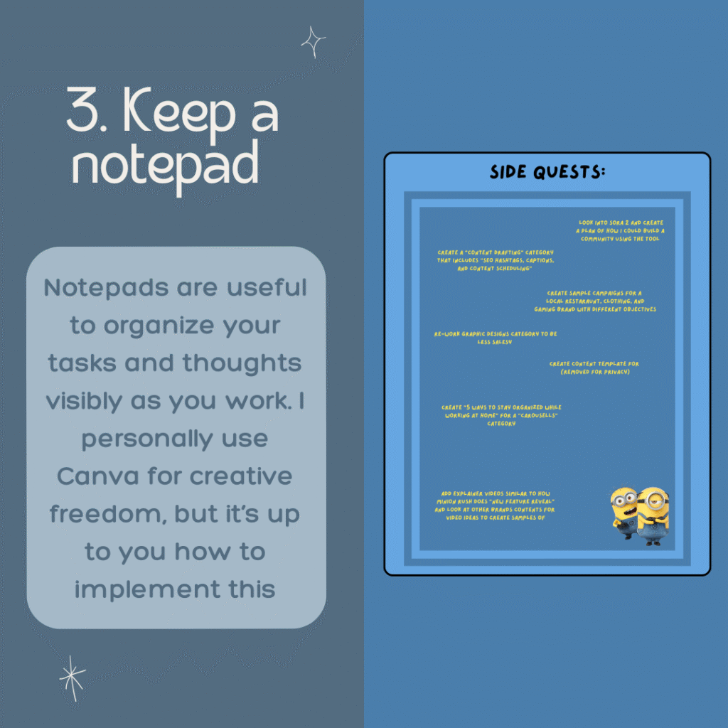 I can handle content ideas myself and stay on top of schedule by planing out days / weeks in advance. I could also schedule posts through Hootsuite, Meta Business Suite, and TikTok Video Scheduler.